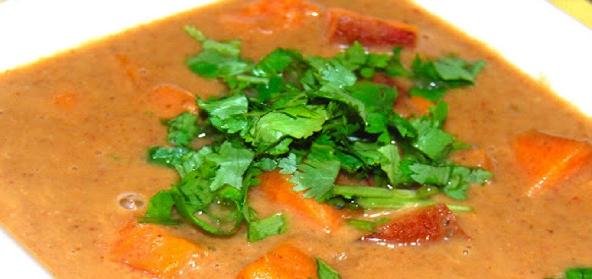 5. Add the tomatoes, water, beans with herbs, peanut butter and curry powder.