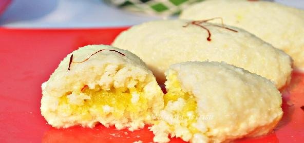- Take off a small ball and flatten it. Take a spoonful of apple filling and place in the centre. Carefully cover the apple mixture and shape it as desired. Serve cold.