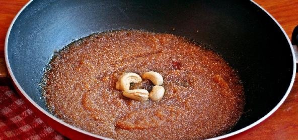 - When the atta becomes a golden brown, add the boiling sweet water
