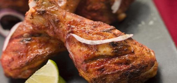 3. Mix together the ginger garlic paste, chopped coriander leaves, yogurt, green chillies, garam masala powder, red chilli powder, salt and a pinch of orange food colour and rub well into the chicken drumsticks.