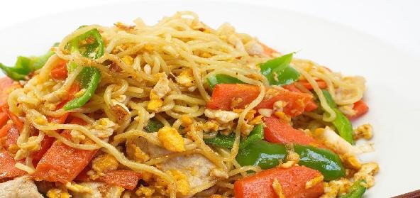 - In a bowl add some fried noodles, sliced capsicum, carrots, and cabbage.