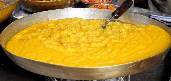 - Soak dal for 4-5 hours and then grind it well. Make a syrup of sugar. Add saffron flakes to it.