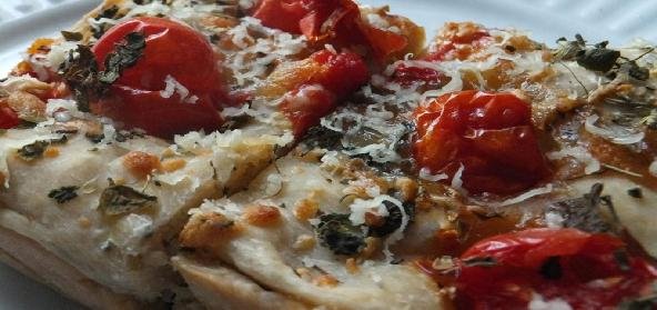 - Brush the top with olive oil and top with cherry tomatoes, kasuri methi, herbs and cheese.