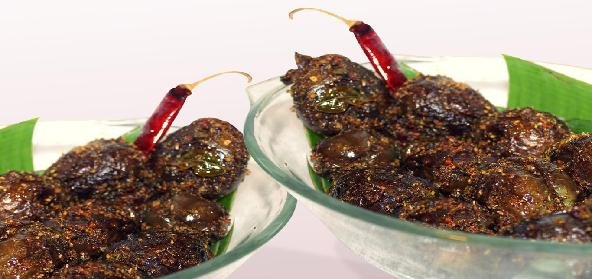 - Pour tomato pickle over it and it with sprinkle gram flour to coat the brinjals.