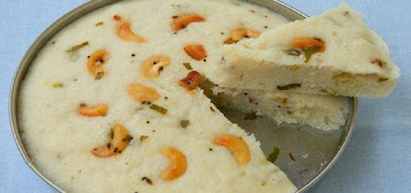 - Pour seasoned idli batter, decorate with fried cashew nuts on top of the batter up to 3/4 level and steam on a medium heat for 20 – 25 minutes.