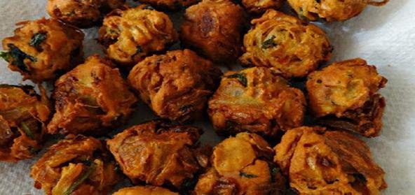 - Add besan flour, rice flour, red chilli powder, salt, turmeric powder, coriander leaves and curry leaves to the onion and mix well and knead it. Do not add any water.