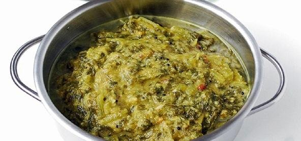 - Pressure cook moong along with the leaves, turmeric, sambar powder and salt.