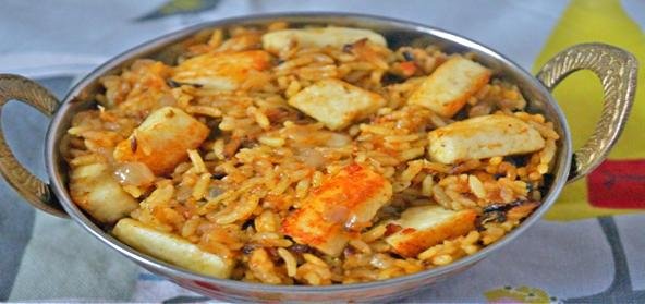 - Pressure cook for 3 whistles and add fried paneer cubes and mix. Serve hot with chips and raita.