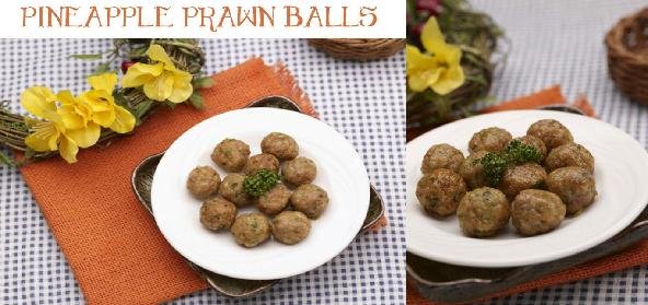 17. Place 1 tsp. of pineapple and onion filling in the centre and close up the prawn paste around it, shaping into a ball.