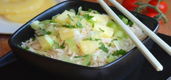 1. Soak saffron in milk and set aside. Simmer pineapple with sugar in water until thick syrup is formed. Melt ghee, stir in garam masala and fry for a few minutes.