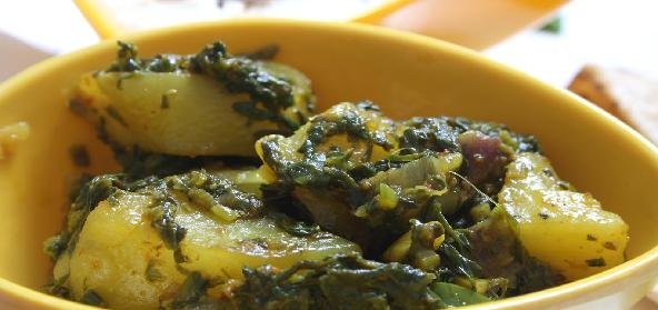 - Add finely chopped spinach leaves and potatoes cut into medium sized cubes.