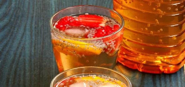 - Put the syrup, soaked sabja seeds and chopped strawberries in a vessel.