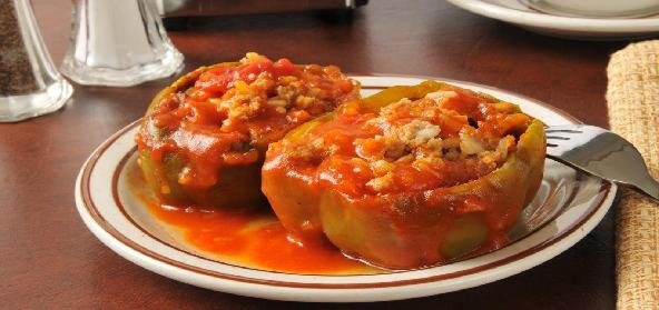 - Stuff green peppers with mixture and place them in a circle in an rectangular container. Set aside.