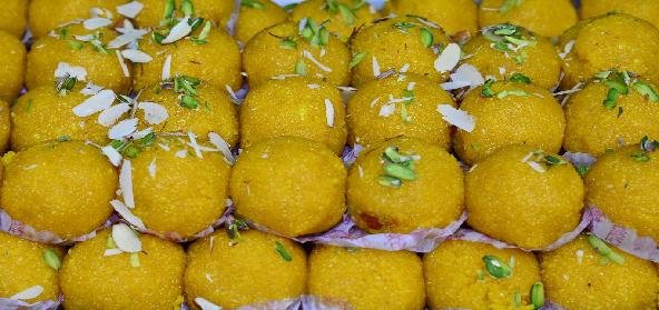 - Add the boondi mixture and stir till the syrup coats the boondis.