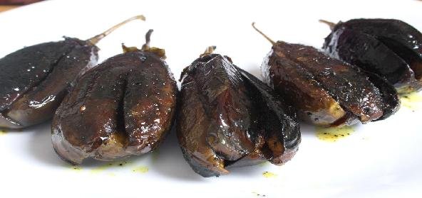 1. Make two slits in each brinjal from top towards the stalk end, without separating quarters. Leave the calyx and a bit of the stalk end on.