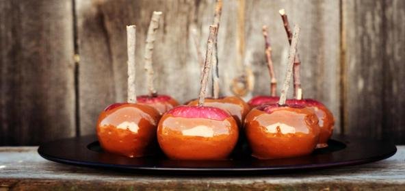 5. Tilt the pan so that the toffee is in one corner, dip the apples into the toffee twisting them to coat all over.