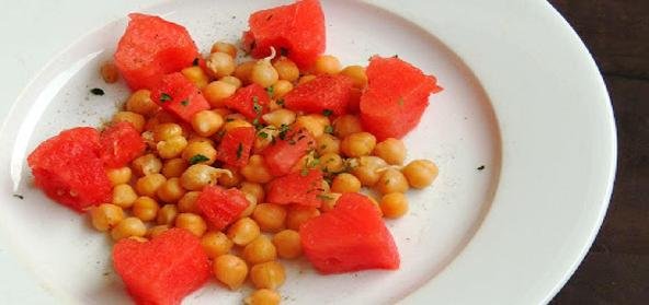 1. Arrange the watermelon cubes, cooked chickpeas in a plate.